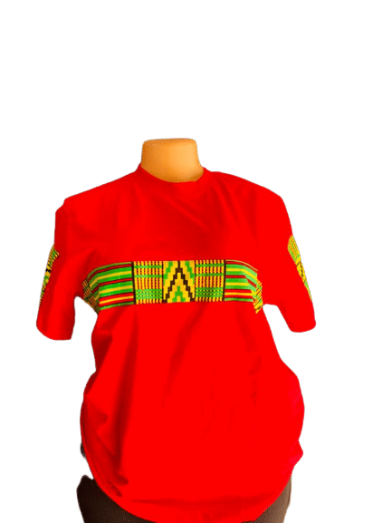 A red t-shirt tailored and designed with a green ankara African print, in the shape of the African continent.